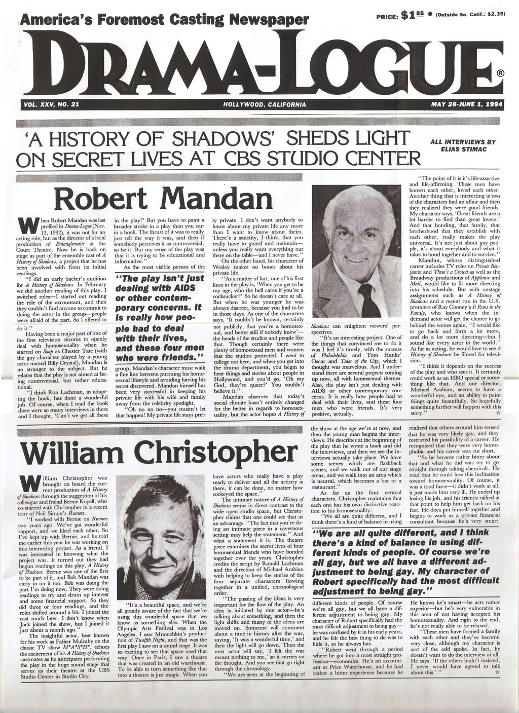 It was the “critics winner” with 5 awards for REVIVAL (Center Theatre Group), LEAD ACTOR (Alan Mandel), ENSEMBLE and SET (John Iacovelli).